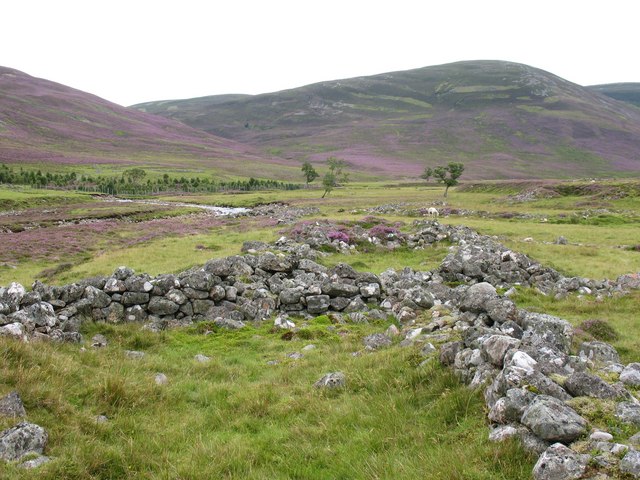 Go round the east side of the loch, which is at the watershed. The faint path line disappears, but descend northeast then north along the Allt Cac Dubh which merges with Allt Beinn Iutharn at NO070803. Ford the burn here to find an occasional path on its west bank leading to the ruins of Altanour Lodge. From there a good track, crosses and re-crosses the Ey Burn, meandering across grassy haughs, before descending on the east side of the burn to Inverey.