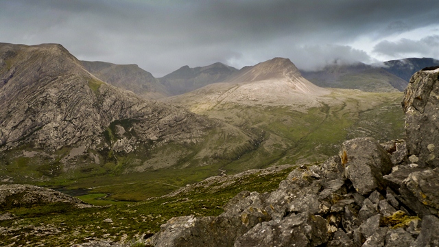 A less obvious route is that through the Bealach na h-Imrich from Srath Beag to Loch Dionard. Although the old route was thought to be probably lost, we've recently received reports (June 2012) of a very good stalkers path running from the sheepfold at NC376509, contouring roughly WSW up and over the southern spur of Conamheall. It gets lost a bit in the rocky area around the highest point, so we don't yet know whether it descends on the west side to Carrachandubh, so that's an explore for another day. However it would seem to present a sensible route between the 2 straths (and gives fantastic views both up Strath Coille na Fearna and across to Foinaven's eastern corries).
