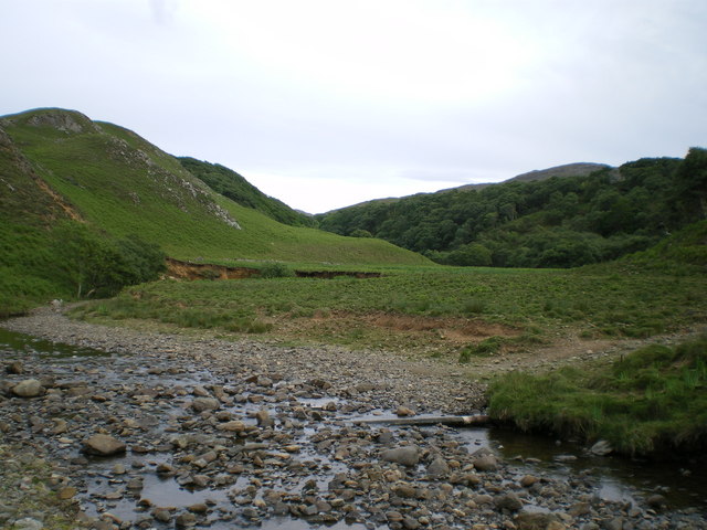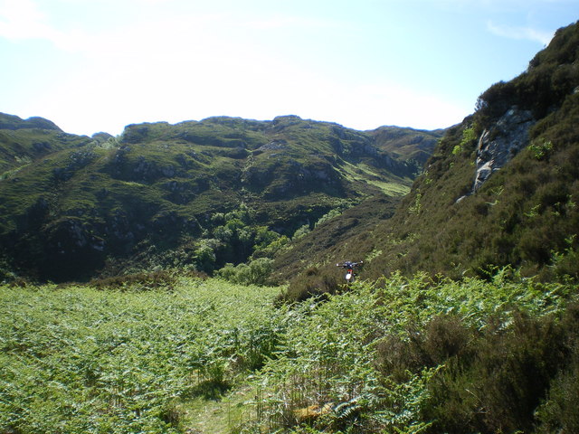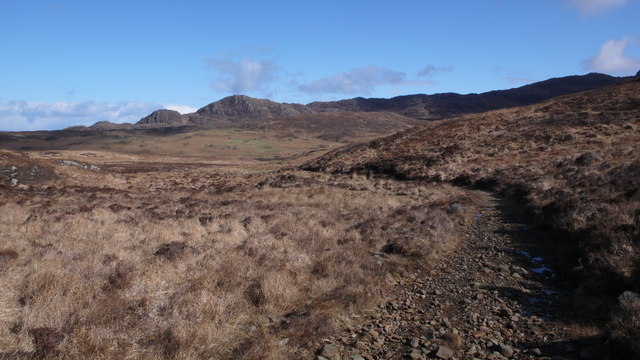 From Kilchoan, take the road northwest in the direction of Achnaha and leave it at NM474675, 200m north of the bridge over the Allt Uamha na Muice. Climb a stile over the deer fence and follow the waymarked path north-northeast which joins up with a track also coming from the road but starting at NM469678. Continue northeast along this signposted path across a circular plain about 4km in diameter surrounded on almost all sides by low gabbro hills, which are the only visible remains of a once great volcano across whose crater the path goes. Reach and pass Glendrian, then at NM475692 go north to the Allt Mhic Cailein and follow it northwest through the Bealach Mor. Enter a native woodland plantation and follow the new track to a ford at NM471705. Here, although within ½km of the coast, turn east towards Fascadale. Follow the path, faint in places, to exit the plantation by a gate at NM479707. Thereafter, a faint boggy path heads east to a small cairn at NM496705, from where the path drops down to Fascadale. Continue east by a minor road to Achateny, then along a track to Kilmory. It is possible to go south from either Achateny or Kilmory to reach the B8007 road where there is a bus service.