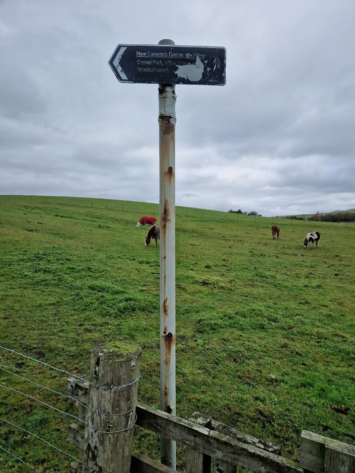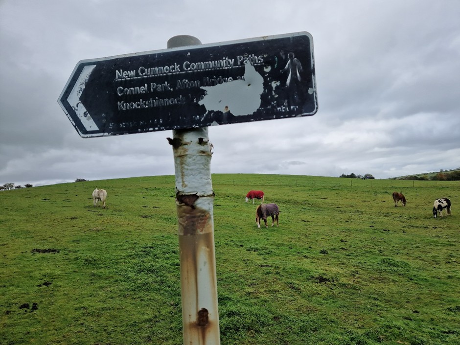 One of the signposts in the New Cumnock Community Paths network is in poor condition and needs to be replaced: it is midway along a path to the Knockshinnoch Memorial. One of the signs is missing, the other is damaged, and the pole is rusty.